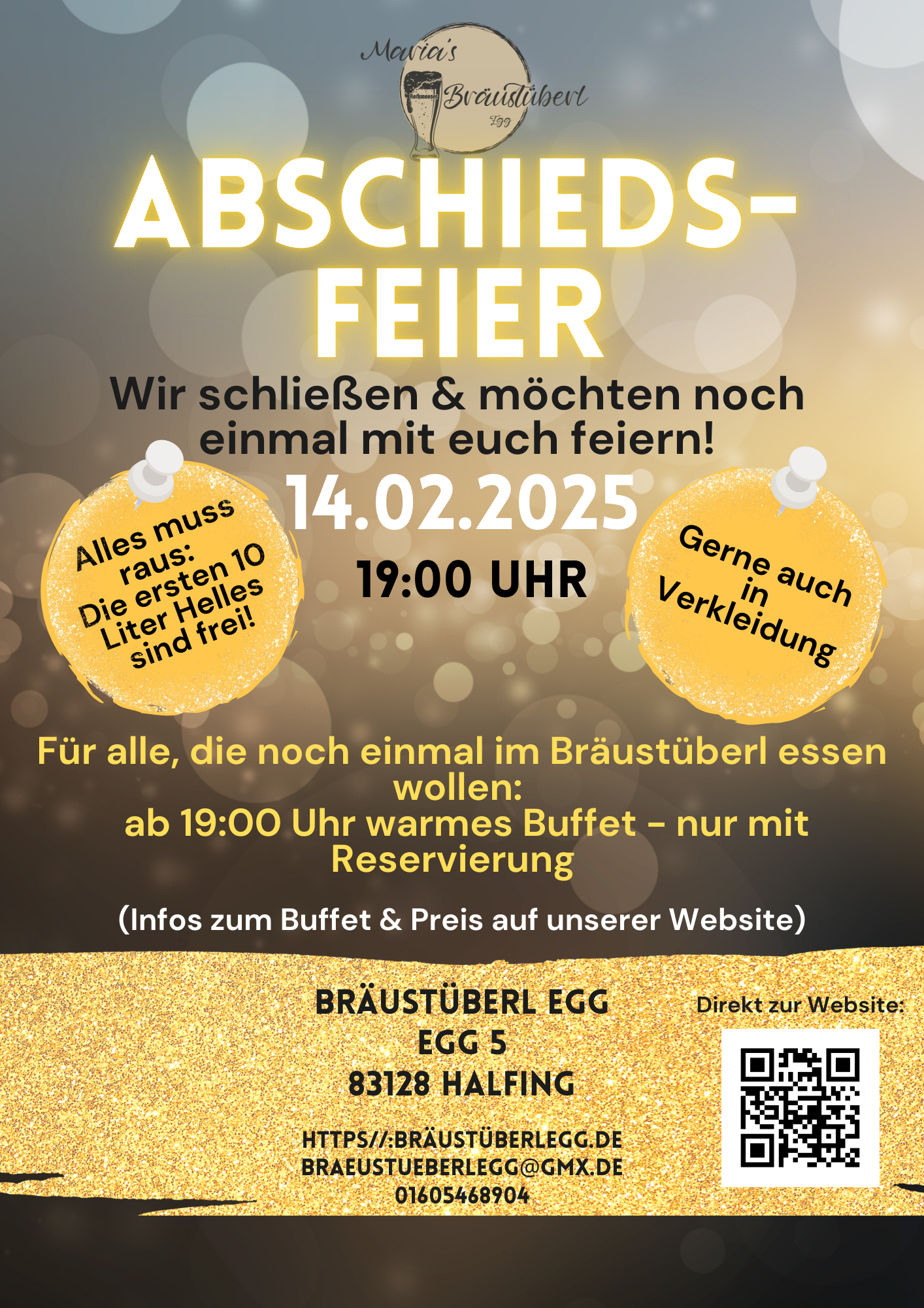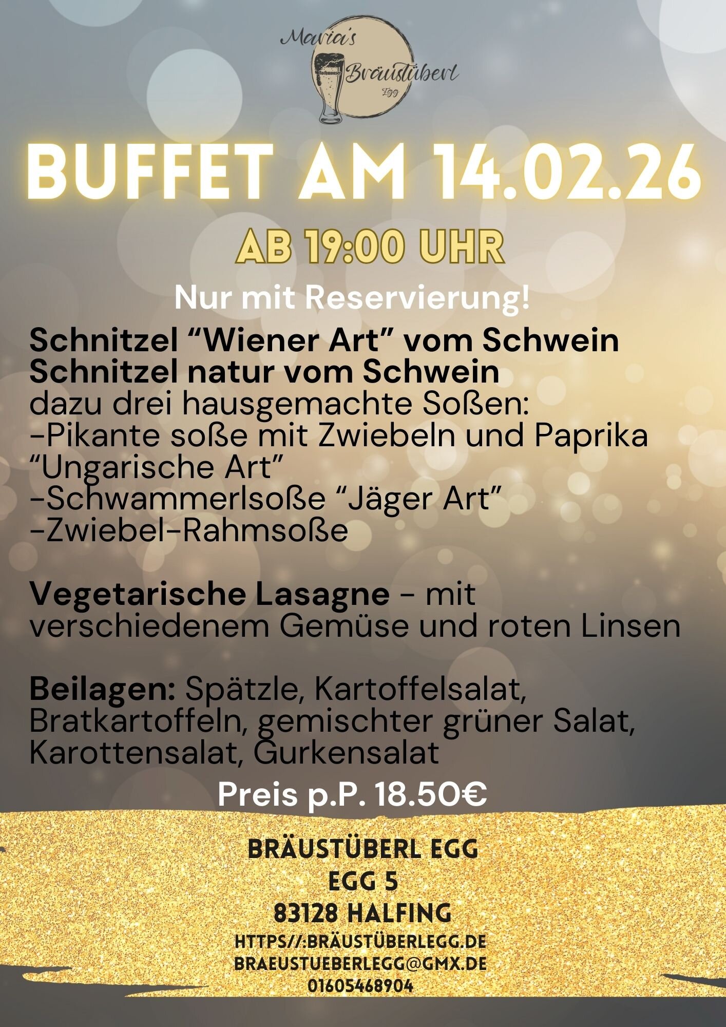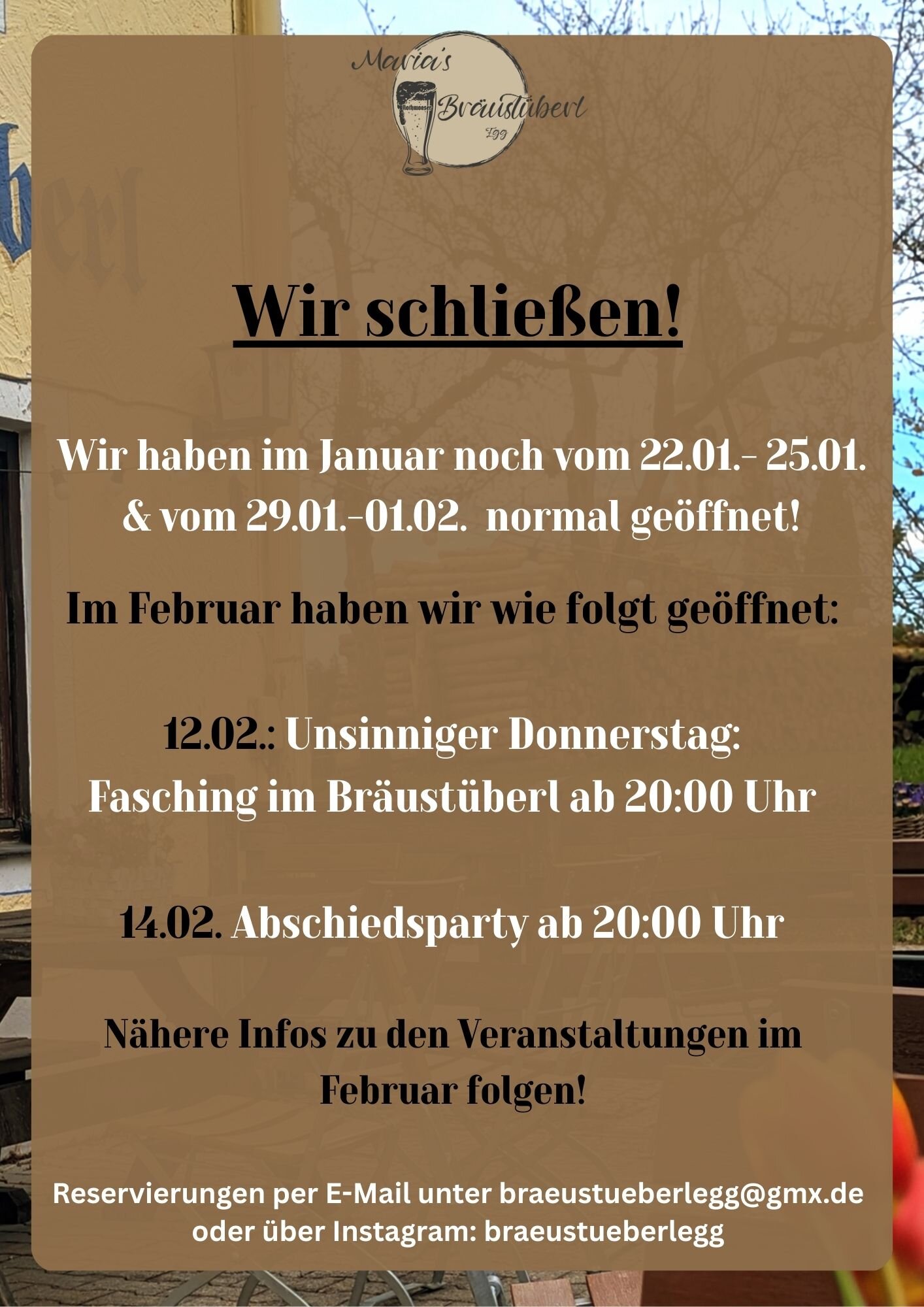 Dafür öffnen wir auf Anfrage auch an unseren Ruhetagen für Sie - sprechen Sie uns einfach an, oder schreiben Sie eine E-mail an: braeustueberlegg@gmx.de.
